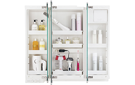 洗剤やボトル類のストック、グルーミングの小物まで収納するモノに合わせて収納スタイルを選びます。スペースに余裕があれば、周辺キャビネットの追加で収納を充実。